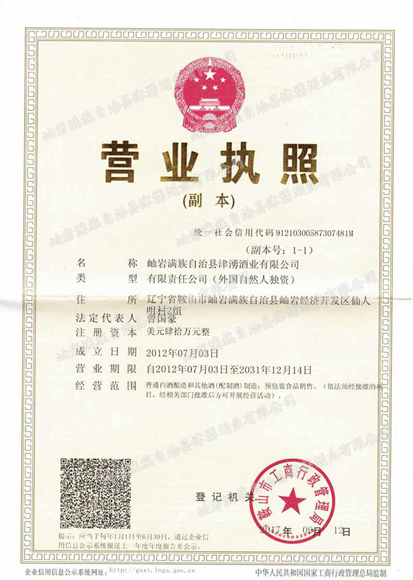 岫巖滿族自治縣津湧酒業(yè)有限公司位于風(fēng)景秀麗、青山綠水的岫巖縣前營鎮(zhèn),公司占地3500平方米,年生產(chǎn)能力100噸釀造醬香原漿白酒。2013年公司產(chǎn)品“津湧豪酒”曾獲得遼寧省“遼寧放心名酒”稱號,公司現(xiàn)正研發(fā)配制酒生產(chǎn)項(xiàng)目,為公司發(fā)展提供技術(shù)保證。公司的注冊資本全部由美籍華人出資。